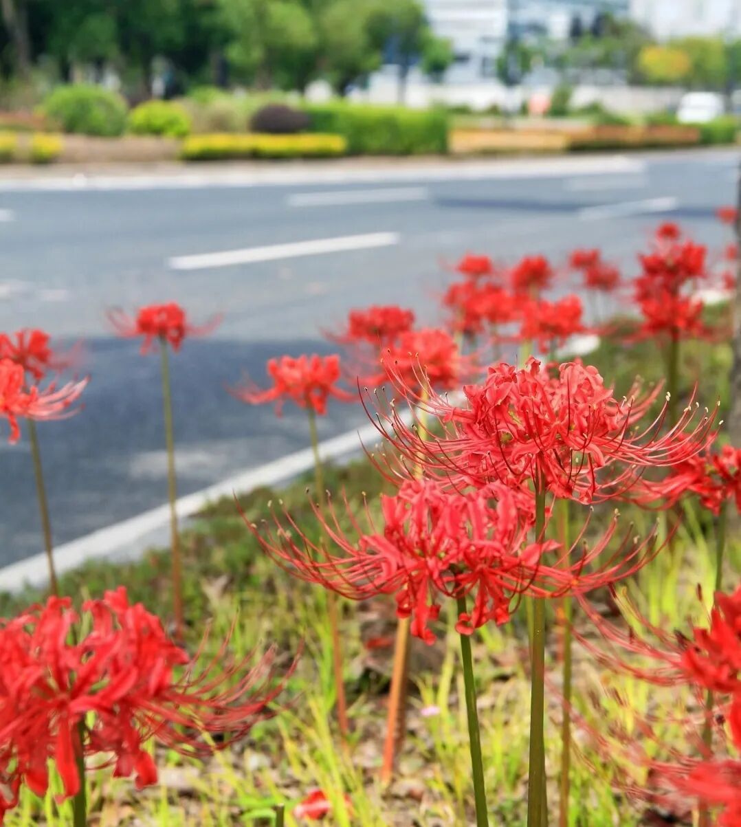 石蒜花原产于我国南方,多生于阴湿的山坡和河岸草地,在阳光充裕的环境下,会开放得更加鲜艳茂盛。如今,国内许多南方城市的公园、植物园,都栽种了大片石蒜花。