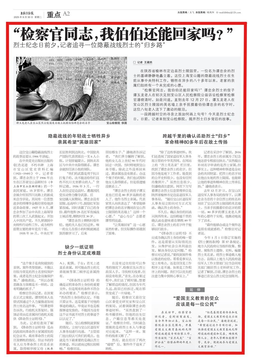 “检察官同志,我伯伯还能回家吗?”谭忠余烈士的侄子谭玉龙老人在初次见到宝山区人民检察院公益检察室检察官潘晓清时,如是问道。直到去年12月27日,谭玉龙老人在宝山区烈士陵园的英名墙上亲手抚摸着伯伯谭忠余的名字时,这位八旬老人流下了激动的眼泪。