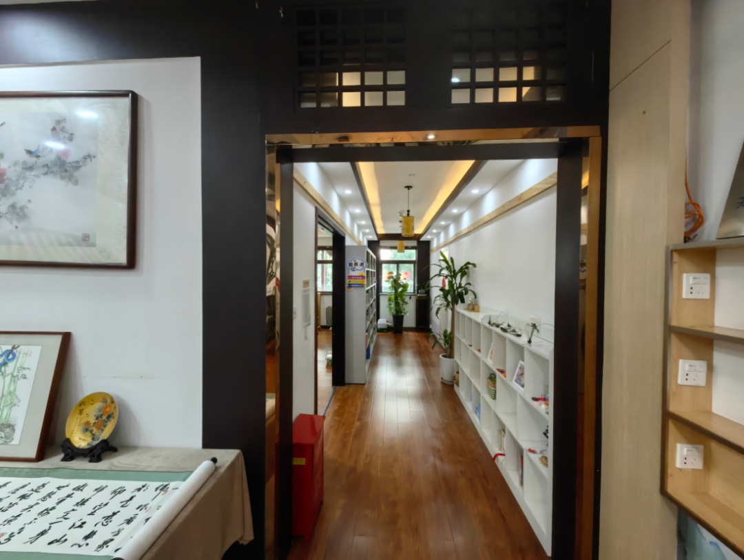 走进位于沪太路150号2楼的新空间,浓郁的传统文化气息扑面而来——木质书架上,《弟子规》《唐诗三百首》等国学典籍与儿童绘本整齐排列;墙面悬挂的水墨画、书法作品,让“添睦国学”的特色融入空间每一处细节。