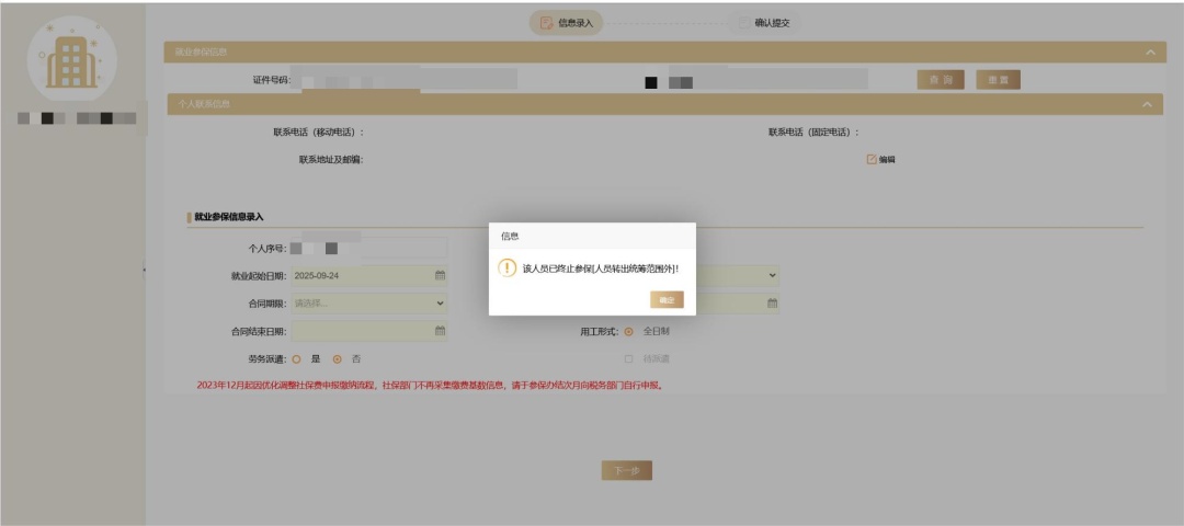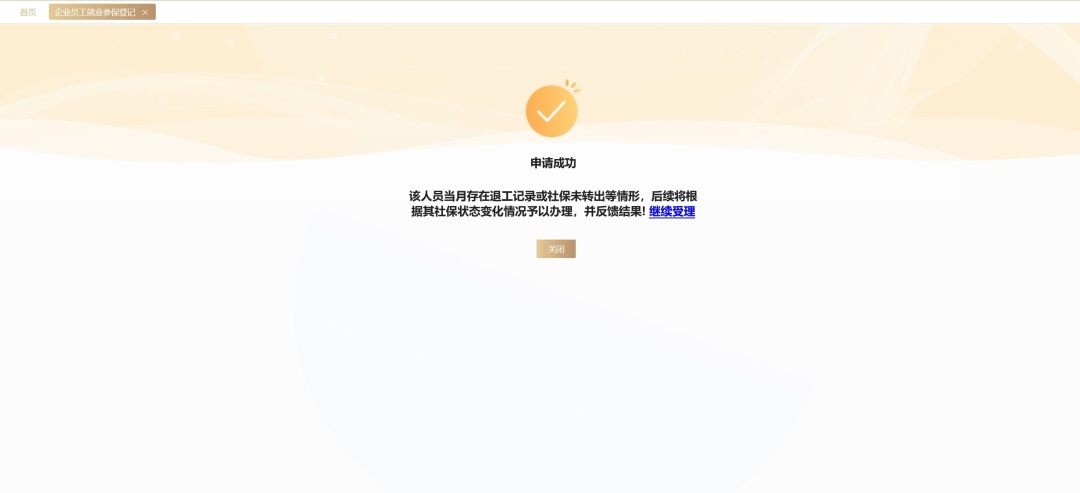 李经理:小编,你好!我在“一网通办”平台给本月入职的员工办理“企业员工就业参保登记”时,系统提示“该人员已终止参保【人员转出统筹范围外】!”,这种情况是什么意思呢?我需要去线下办理吗? 小编:您好!无需至线下办理。这种情况通常是员工曾经在上海参保,后来因为就业地的变动,将上海缴纳的养老保险关系转移到了外省市,再次返回本市就业参保时,就会出现这样的提示。 在办理时,只需点击提示框右下角的“确定”,正确填写信息并提交,出现如下界面即代表提交成功。 小编:提交成功后,该业务进入“办理中事项”,待社保中心审核后可至“已办事项”中查询办理结果。之后您就可以正常办理后续业务了。