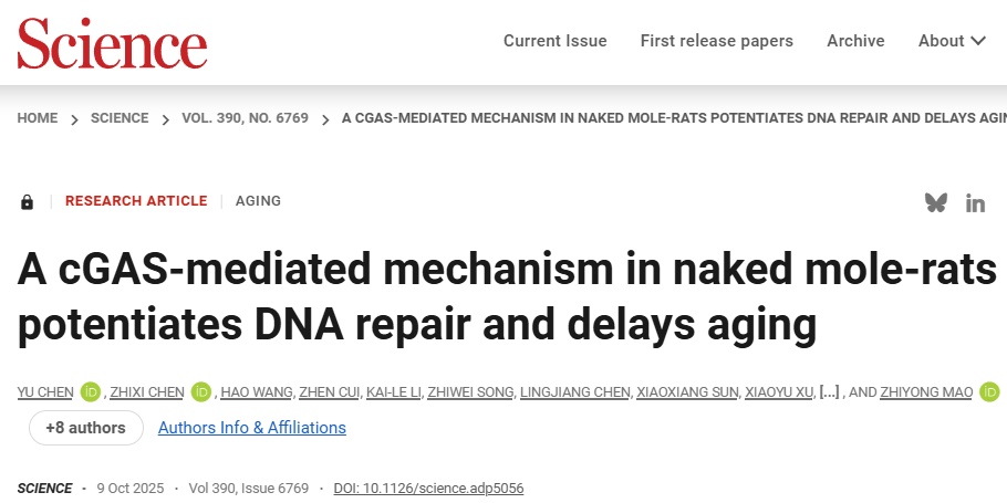 同济大学生命科学与技术学院、附属妇产科医院毛志勇教授团队的这一科学发现在线发表于国际顶级学术期刊《科学》(Science),论文题目是“A cGAS-mediated mechanism in naked mole-rats potentiates DNA repair and delays aging”(裸鼹鼠中一种由cGAS介导的增强DNA修复及衰老延缓机制)。