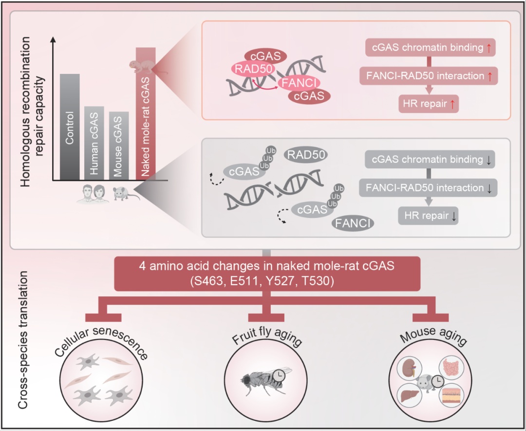 早在2018年,毛志勇教授团队与同济大学医学院、附属上海市肺科医院戈宝学教授团队合作发现人类cGAS蛋白在DNA损伤后会入核并抑制同源重组修复,导致基因组不稳定。基于此合作研究,研究团队发现裸鼹鼠cGAS的功能发生颠覆性逆转——它可显著提升同源重组修复效率。