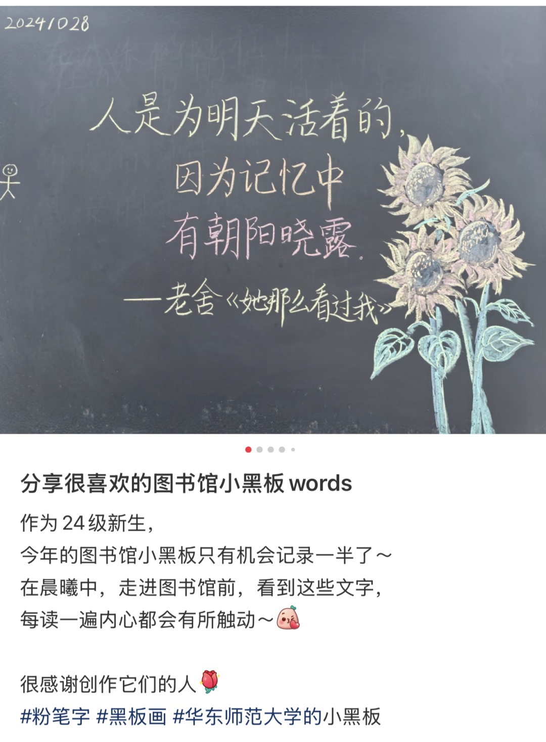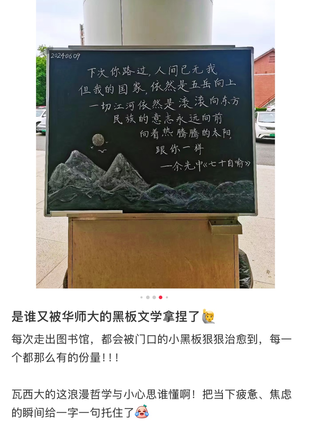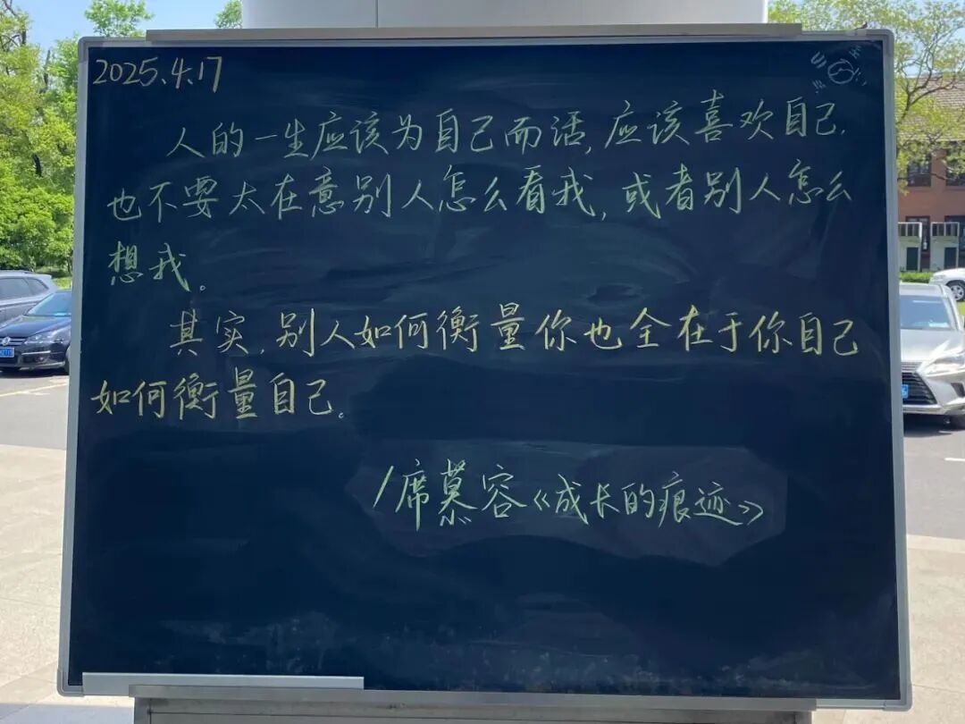 默默奉献的板书侠们用文字搭建起心灵桥梁,让每个驻足的身影都能感受到被看见的温暖。他们的付出不仅点亮了校园角落,更在无数个时刻给予迷茫学子前行的力量。