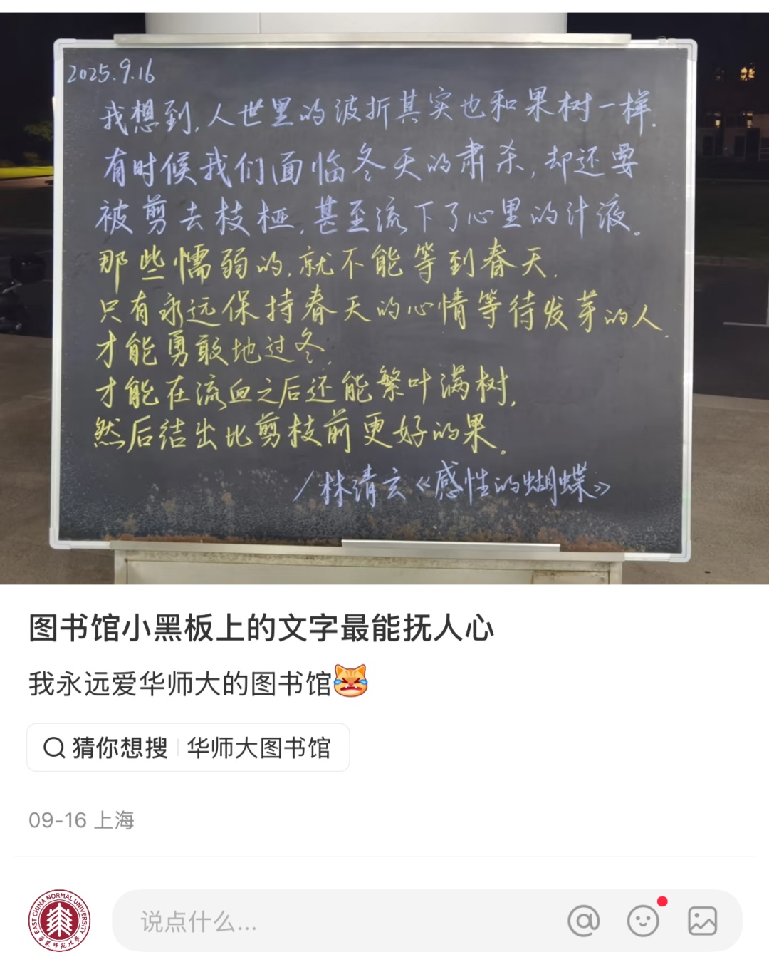 无论你带着期许还是忐忑前行,别忘了偶尔在图书馆门前稍作停留。看看这块“会说话”的小黑板。它或许不能给你确切的答案,但那粉笔的温度、文字的力量,定会化作拥抱未知的勇气。