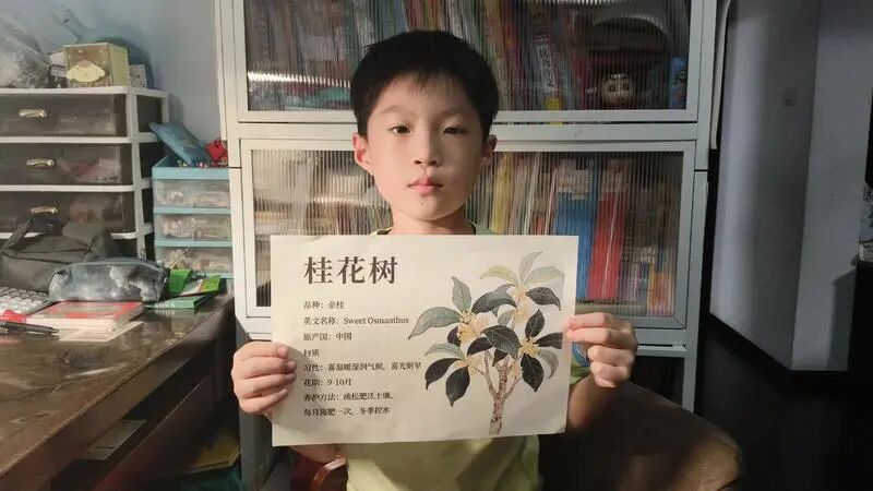 在铭牌制作环节,亲子家庭共同查阅资料、设计样式、制作成品。12岁的小睿负责研究有声铭牌的录制方法;9岁的小宇则介绍了自己认养的桂花树,包括其学名、原产地和栽培历史。