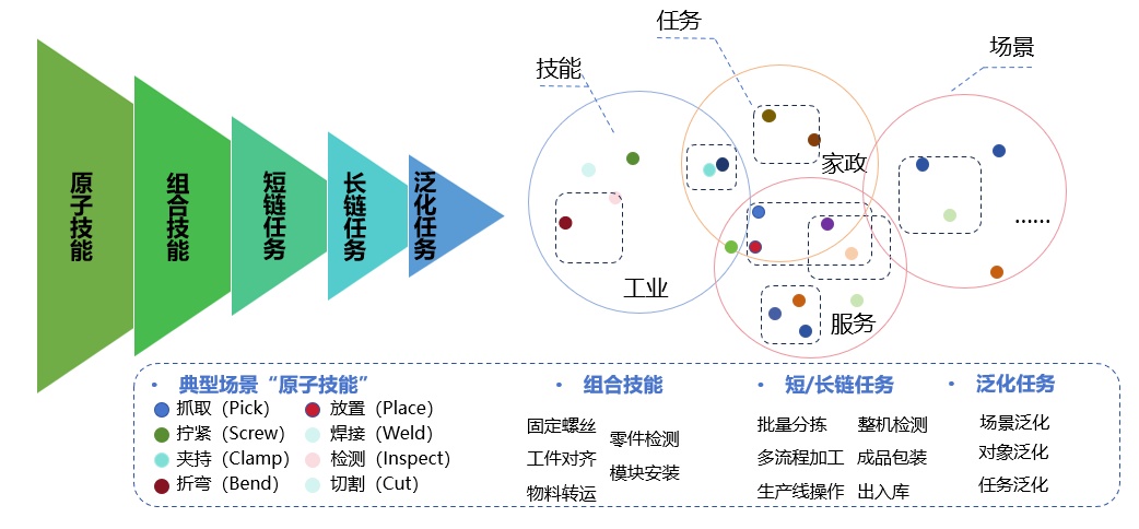 平台面向机器人多场景、多任务应用需求,构建覆盖原子技能、组合技能、短链任务、长链任务及泛化任务的具身智能训练与验证全流程服务。
