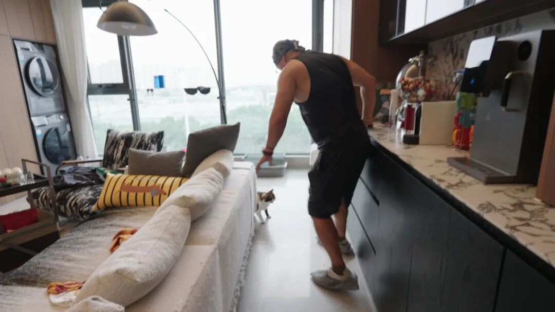 清晨5点半,天还没大亮。记者在嘉定的撸猫馆见到了宠物托管师桓聪,一身黝黑的腱子肉,包着头巾。