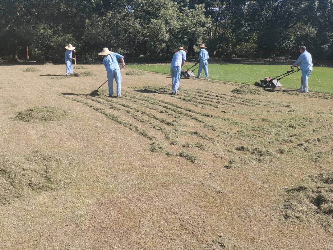 在施肥与播种之前,养护人员还进行了一系列细致的前期工作:清除杂草、人工修剪、为草坪打孔松土、均匀播下黑麦草籽,轻轻滚压,再辅以适量补水,保持土壤湿润,为草籽发芽创造良好条件。