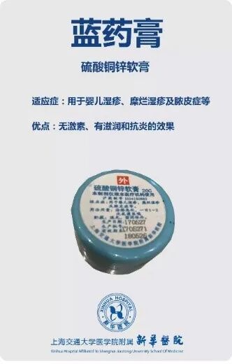 硫酸铜锌软膏,即蓝药膏。特别适合小婴儿长湿疹(小宝宝身上起的小红疙瘩,痒痒的)、糜烂湿疹(湿疹严重了,皮肤都烂了)还有脓皮症(皮肤上长脓包啦)这些情况。