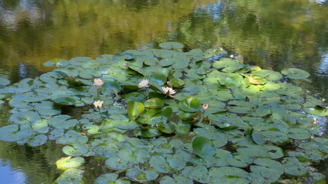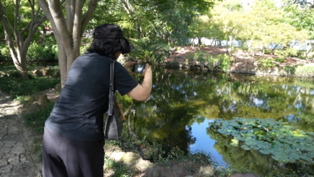 这样的暑热,倒也描绘出另一番景致。池中残荷的叶子还未完全枯败,边缘虽已卷曲泛黄,但大片叶面仍顽强地支撑着最后的绿意。偶见绽放的睡莲,与倒映其中、依旧浓密的树荫,构成一幅夏日才有的苍翠画卷,吸引不少游客驻足。