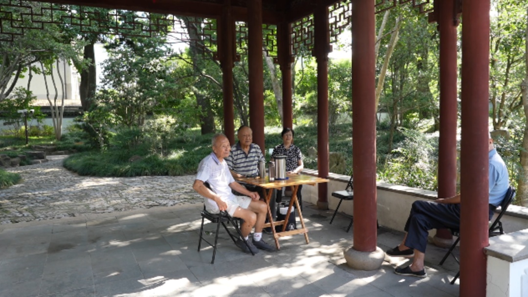 亭台内,不少市民正在喝茶乘凉。许先生今年92岁,来秋霞圃纳凉聊天是他坚持了数十年的习惯:“早上趁着阳光不大,赶快出来凉快凉快、看看美景,不然天天闷空调房里也不舒服。”