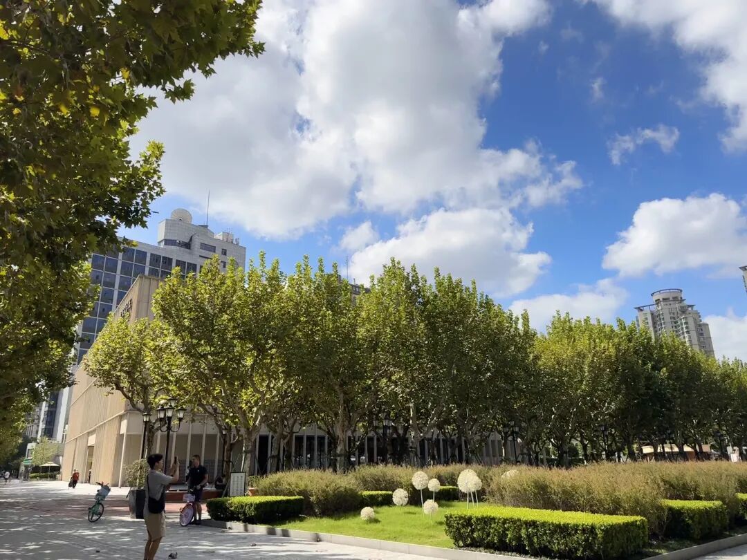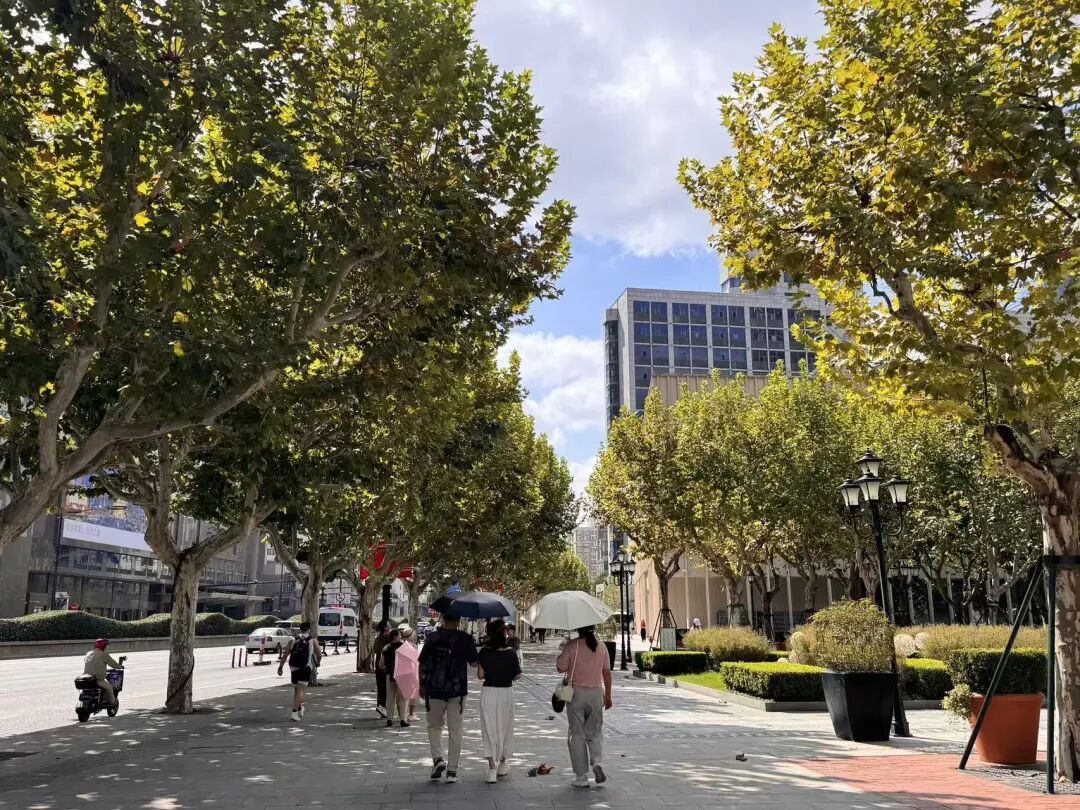 上午十点,申城云层流动,阳光在明暗间交替。徐家汇书院广场上,行人纷纷撑伞躲避日头,快步躲进树荫。凉风拂过阴凉处,带来些许惬意;而阳光直射的地方,热意依旧弥漫。不少市民在树荫下闲坐聊天。