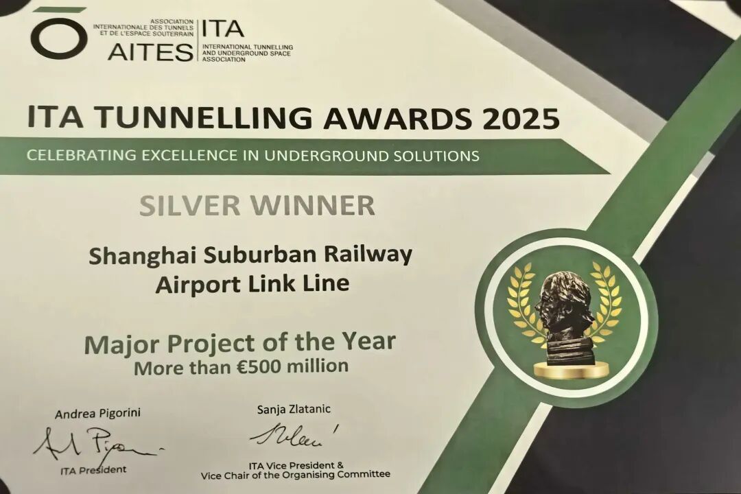 近期,经过全球多个国家和地区的角逐,2025年度国际隧协(ITA)大奖获奖名单在塞尔维亚首都贝尔格莱德正式公布。其中,由上海申铁投资建设并组织申报的上海轨道交通市域线机场联络线工程脱颖而出,荣膺重大工程银奖(超五亿欧元)。这是国内首个斩获此项大奖的轨道交通市域线工程。