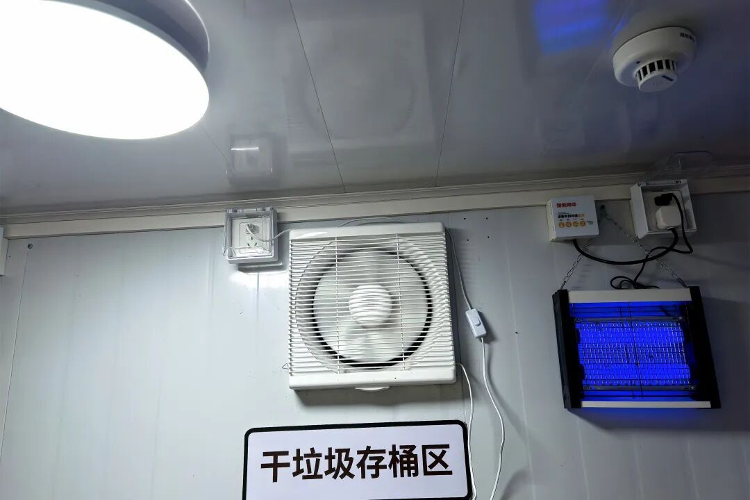 垃圾箱房内还增加灭虫、除臭、节能照明装置、排风扇等通风设备,防止异味飘散,外部也增加洗手池、拖把池、冲洗管等清洁设备,方便保洁每日对箱房进行清洁维护。