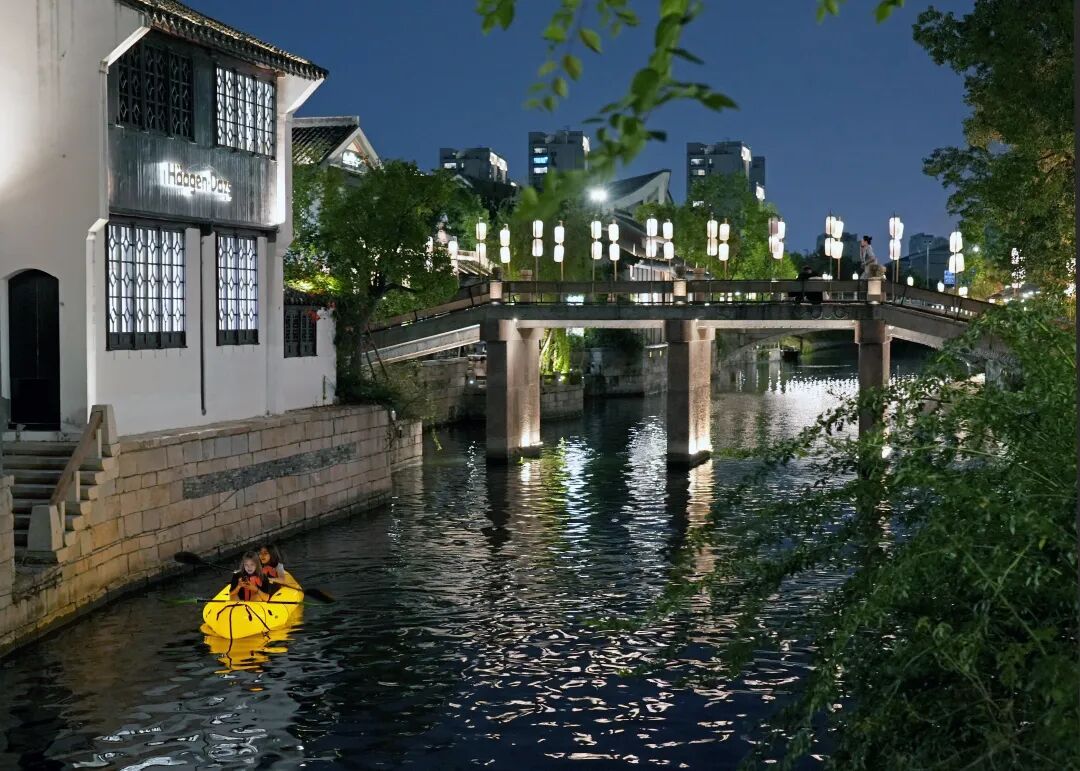 夜幕下的蟠龙新天地,千年水乡与现代光影交融,游客们在古镇的灯火、市集的烟火与滨水空间的桨声灯影中,感受夜游的诗意与热闹。