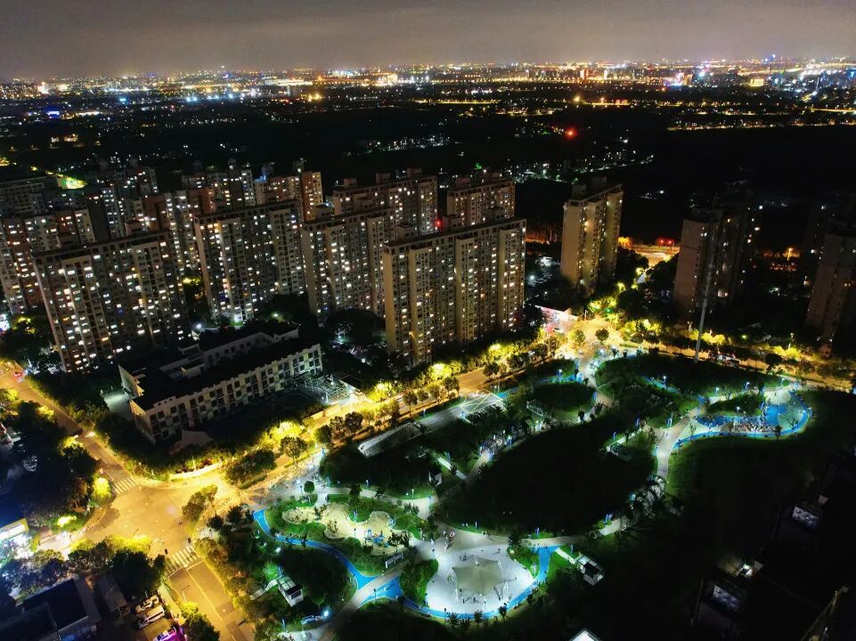 夜幕下的徐泾北大型居住社区灯火通明,居民们伴着柔和的灯光散步闲谈,孩子们在公园广场欢笑追逐,处处洋溢着亲切温馨的烟火气息。