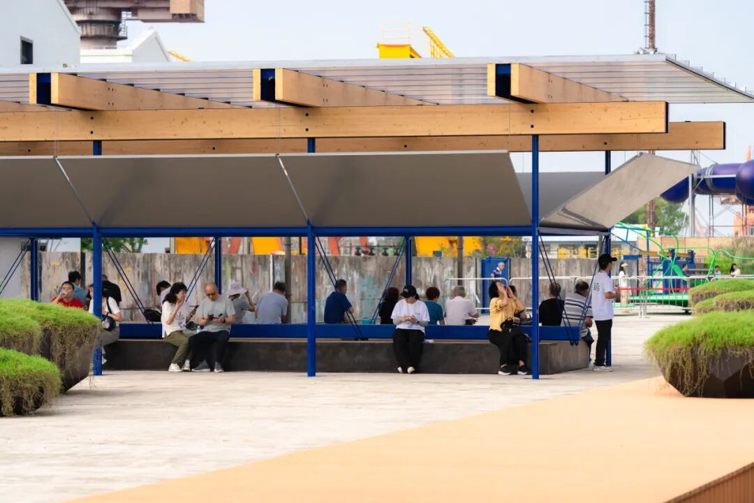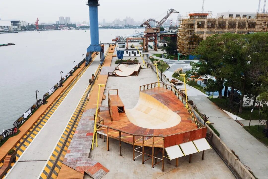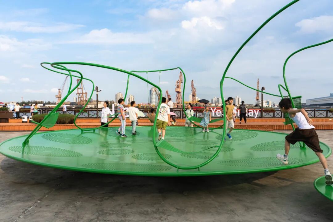 滨江沿线作品着力满足市民观景休闲需求及年轻人喜爱的活动。《航舵》跨越防汛墙搭建望江平台,为市民打造了极佳的观景视野和阶梯聚场。《太阳机器》是专为儿童设计的乐园,小朋友们在这里畅快玩耍蹦床、秋千和摇摇椅。《甲板》采用旧木材搭建开放性的碗池和波浪型坡道,为滑板爱好者提供了独特的滨江板场,也为普通市民提供了零基础培训体验。