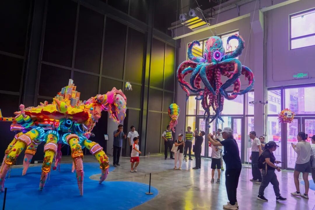 B馆与A馆之间数字媒体艺术作品《重生Flying Birds》将两个塔吊化为飞鸟在光影流转中完成“振翅欲飞”的重生蜕变。每半小时一场的光影秀让众多市民驻足观赏,孩子们在互动追光中奔跑,成为广场的主角。