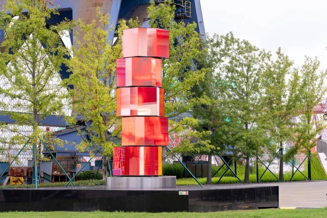 复兴轴线上的艺术作品旨在用科技艺术激发开放空间的趣味性。船台公园入口的《猫的叠加态》憨态可掬,让每位市民都忍不住走近合影,在AR技术的叠加下又能和猫一起在虚拟场景里玩鱼。《复兴:更迭的浪潮》是一座不断转动的数字塔装置,呈现出炫彩的数字画面,成为轴线焦点。