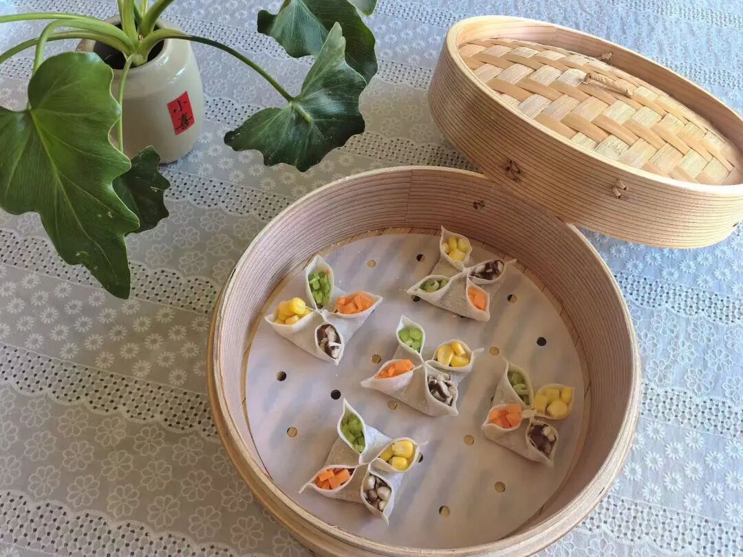 5.将包好的四喜蒸饺放入蒸笼。