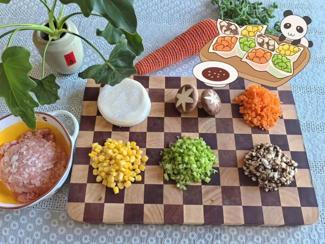 猪肉馅、葱姜花椒水、饺子皮、香菇、胡萝卜、玉米粒、芹菜、生抽、蚝油、鸡精、料酒、盐、胡椒粉、香油。