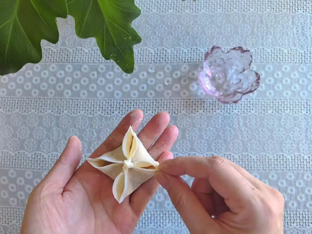 3. 沾水对折捏紧中间,再捏紧另外两边,把4个孔挨个捏紧成花瓣状。