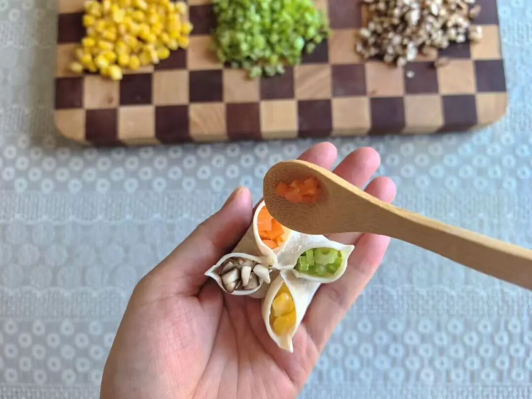 4.填入胡萝卜碎、香菇碎、玉米粒、芹菜碎。