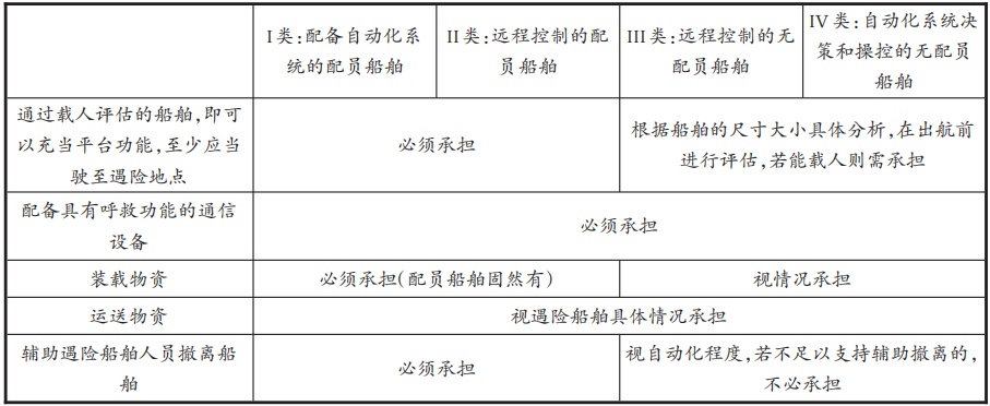 尽管实施救助对于没有配员的船舶来说在操作上有很多阻碍,但是,若因此而免除海难救助责任,特别是人命救助,则对海洋秩序的维护将有很大不利。即使没有配员的船舶在具体的诸如辅助转移遇险船舶人员、转移财产等方面的义务具有一定困难,但配备救助设备、物资等义务仍然是可以完成的。所以,救助义务的具体界定也应当综合船舶配置的高低、尺寸大小等因素综合界定。并且,在无人船救助义务的界定上,需要对每个无人船在出航前就进行评估和检测,以确定其所需要承担的救助义务。根据IMO的四类无人船分类进行的救助义务界定如下。