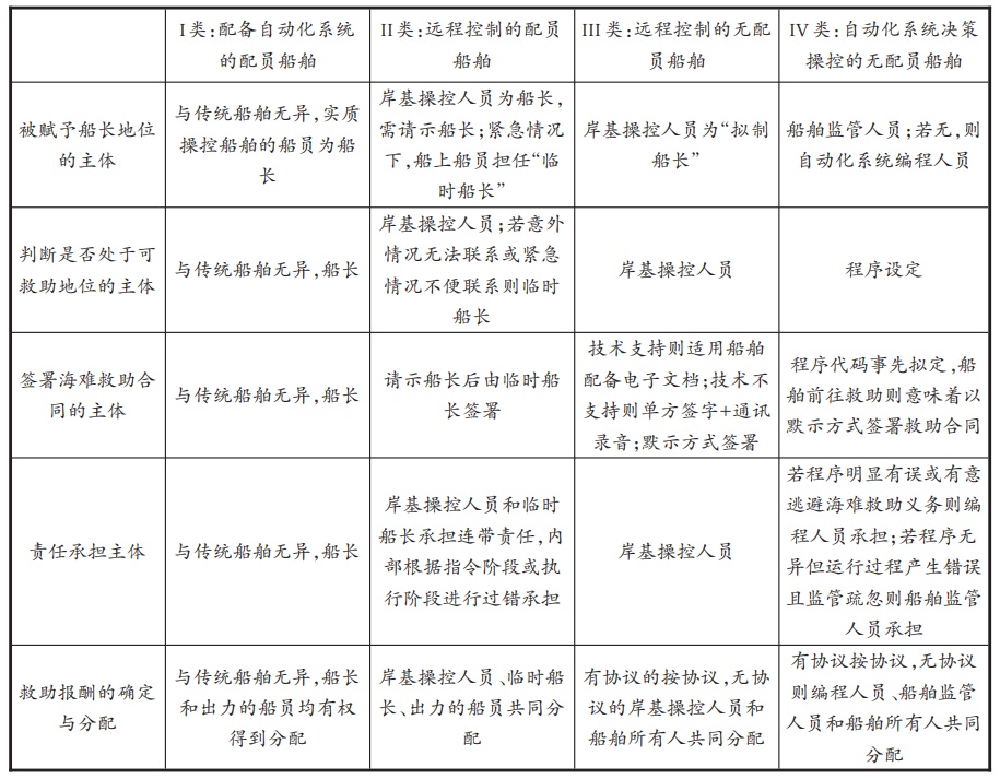 IMO对于第I类无人船的定义是配备自动化系统的配员船舶,该类型与传统船舶最为接近,特征仅是传统配员船舶上加装自动化系统,也就是某些在传统船舶中人工实现的功能和装置由智能设备替代。此类船舶由于其操控人员仍在船上,则在海难救助的各主体上均与传统船舶无异,仍由船长担任即可。
