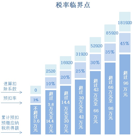 目前税率跳档位有6 个临界点,分别是3.6万、14.4 万、30万、42万、66万、96万。 一旦到了临界值,在每月收入基本不变的情况下,预扣的个税就会有所不同。