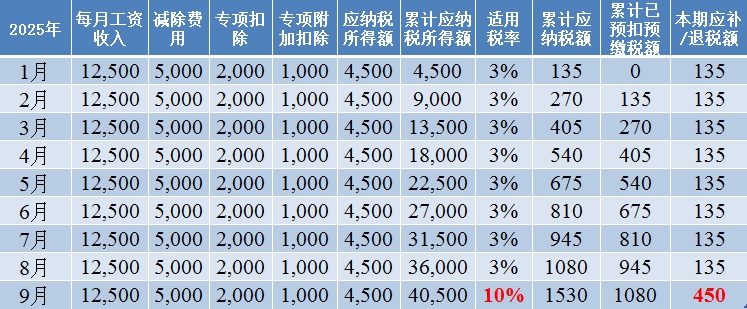 举例:纳税人张三2025年每月取得12500元(包含工资、预发绩效奖等),专项扣除2000元/月,专项附加扣除为1000元/月,预扣预缴税款如下: