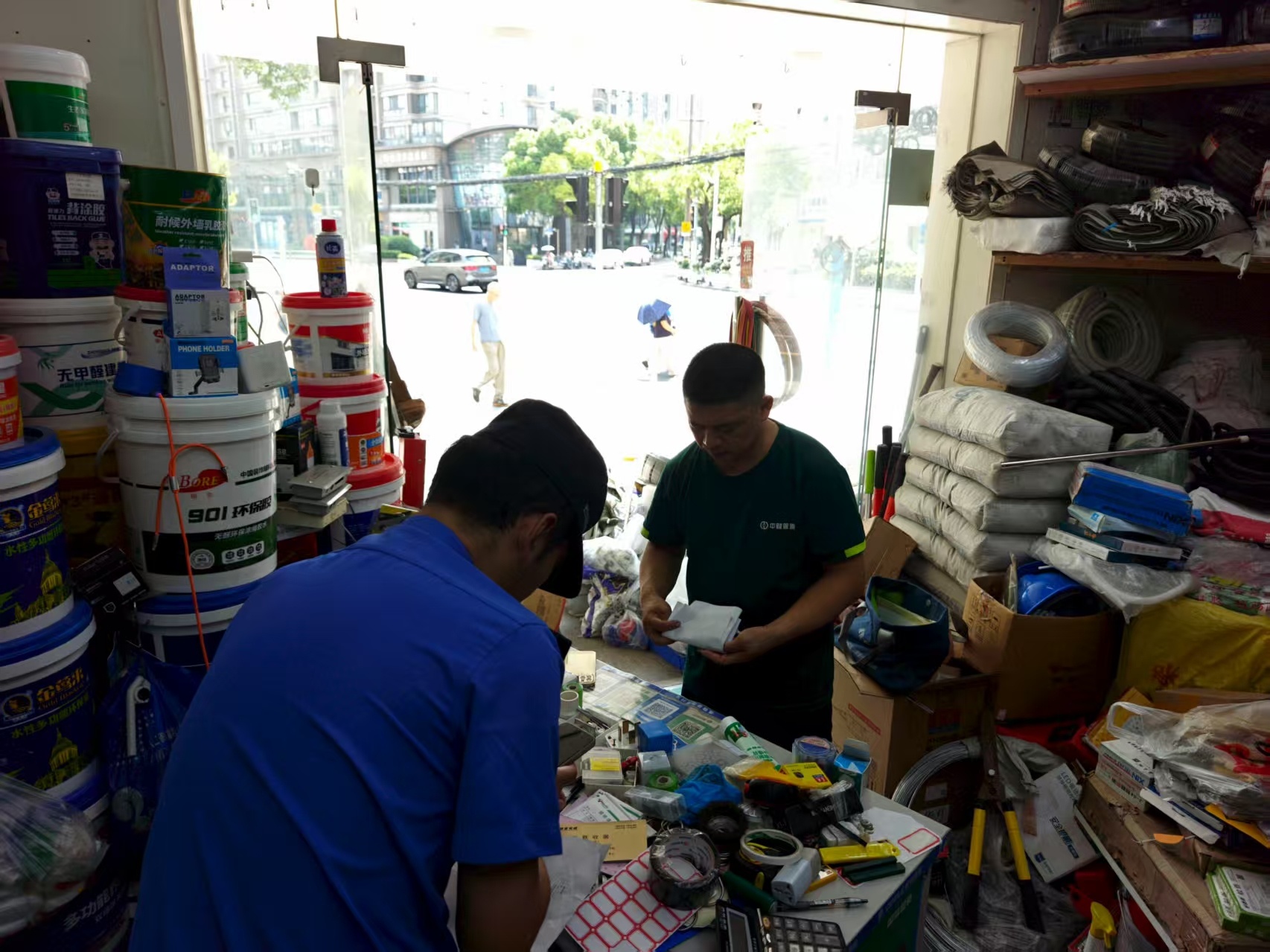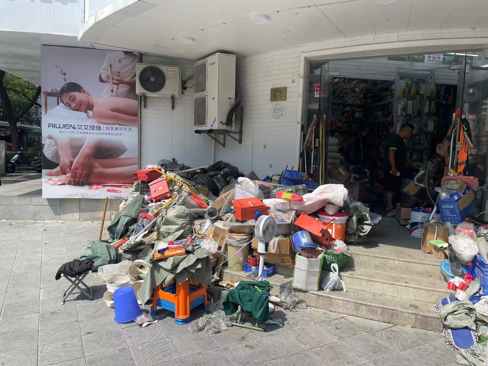 接到投诉后,综合行政执法队立即派执法队员前往现场。经现场核查,该店铺门口确实堆放了塑料桶、椅子、废弃材料等大量货物,堆放面积约10平方米,未占用消防通道,未堆放危险物品,但已对公共通行及街区市容环境造成轻微影响。见此,执法队员找到该五金店老板黄某某了解情况。据他所说,“其店铺刚从普善路搬迁至此,因新店室内空间较原门店狭小,部分货物暂时无处存放,便临时堆放在店外”。