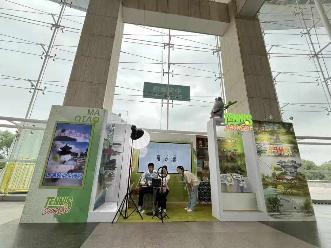 除了志愿服务的身影,旗忠网球中心外的直播舞台也格外热闹。在马桥镇与赛事合作的文创集市中,闵职院数字经贸系三名跨境电商学生——叶佳敏、陈祺尧、赵喆雅,通过为期四天的直播带货活动,让“马桥出品”走向更广阔的舞台。