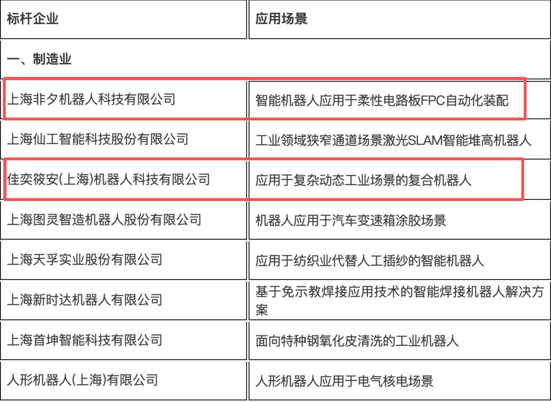 《2025年度上海市智能机器人标杆企业与应用场景推荐目录》 入选名单 上海非夕机器人科技有限公司 在制造业领域,来自马桥人工智能创新试验区的上海非夕机器人科技有限公司以“智能机器人应用于柔性电路板FPC自动化装配”这一应用场景入选标杆企业。 非夕机器人是一家全球技术领先的AI机器人公司,专注于研发、生产集高精度力控、计算机视觉和人工智能技术于一体的自适应式机器人产品,为不同行业的客户提供基于非夕机器人系统的整体、创新性的解决方案和服务。 针对FPC柔性电路板在自动化装配中,因轻薄易形变,导致装配难的世界性难题,非夕机器人带来了突破性解决方案。其自适应机器人融合高精度力控与AI视觉,如同赋予机器人“触觉”与“手眼配合”能力,能柔顺、精准地完成FPC插装,成功率高达99%以上。同时,该技术实现了全流程数据追溯,已成功应用于消费电子和汽车电子领域,为精密装配树立了新标杆。 佳奕筱安(上海)机器人科技有限公司 在制造业领域,来自“大零号湾”的佳奕筱安(上海)机器人科技有限公司以“应用于复杂动态工业场景的复合机器人”这一应用场景入选标杆企业。 佳奕筱安(上海)机器人科技有限公司是一家专注于研发机器人控制器及机器人智能力控系统的公司,为客户提供一体化的力控技术产品和解决方案。 传统的工业机器人切换任务需耗费大量时间重新编程与调试,单一功能模块难以应对复杂动态环境,缺乏实时感知与自主决策能力。本系统通过高自由度柔性关节、多模态感知矩阵与智能控制算法的深度整合,解决了这些痛点。采用AI+智能调度模式,实现拉动式生产与动态线平衡,让生产流程更高效。搭载3D视觉与精准力控技术,达到丝级装配定位,确保操作精度。换线时间仅需1天,节拍时间35,大幅提升产线应变能力。系统整合多模态感知与智能算法,AGV定位、协作机器人重复定位等核心参数行业领先。六维力控实现精密装配,复合底盘保障灵活避障,为汽车制造、电子装配等行业提供高效精准的智能作业解决方案,助力智能制造落地。 上海发现者机器人集团有限公司 在商业社区服务领域,华漕镇落地企业上海发现者机器人集团有限公司以“烹饪机器人在集中供餐场景中的应用”这一应用场景入选标杆企业。 上海发现者机器人集团成长于黑龙江省发现者机器人股份有限公司和哈工大的技术基础,是中国最早开展烹饪机器人研究的企业之一,主要从事厨房机器人以及智能中央厨房配套产品的研发、生产以及销售。智能烹饪机器人有语音提示、图文操作指引等,能大幅降低使用门槛,让智能做菜更便捷。发现者机器人以“全流程智能化”为核心突破点,直击传统餐饮行业长期存在的劳动力短缺、成本攀升、效率不足等问题。 从2016年与海尔联合开发智能厨房系统,到2021年主导制定行业标准,再到2022年服务北京冬奥会5万人次用餐,企业始终以技术创新驱动产业变革。下一步,发现者机器人将继续聚焦科技研发创新,开展“智能厨房进社区”计划,让AI智能烹饪机器人走进社区、走进生活。 在9月12日至14日的第二十六届中国美食节暨第三届中国海洋美食文化节上,上海发现者智能炒菜机器人荣获2025全国智能炒菜机器人展演赛金奖。中国国际投资促进会会长房爱卿和中国饭店协会资深会长韩明女士,现任会长陈新华等领导莅临现场展区参观并给予指导,对上海发现者机器人在智能餐饮领域的创新应用给予了高度认可和评价。 上海鲸鱼机器人科技有限公司 在教育领域,来自马桥人工智能创新试验区的上海鲸鱼机器人科技有限公司以“面向青少年的可编程飞行机器人”这一应用场景入选标杆企业。 上海鲸鱼机器人科技有限公司是一家专注于青少年人工智能与教育机器人领域的高新技术企业,业务涵盖教育机器人软硬件的设计、研发、生产与销售,致力于提升全球青少年的人工智能素养。 鲸鱼机器人致力于青少年AI启蒙,构建了覆盖3—22岁全年龄段的“产品+内容+活动+师训”四位一体教育生态。其可编程、可拼搭的模块化机器人产品,配合13级循序渐进的编程体系,将复杂的AI技术转化为趣味盎然的实践体验,激发青少年的创造力和科学兴趣,已进入全球数万所中小学,为培养人工智能时代后备人才奠定了坚实基础。 转载请注明来自今日闵行官方微信