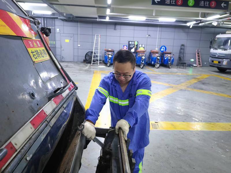“这样才能有效避免小问题演变成大故障,既保障了出车率,也降低了总的维修成本。”他总这样强调。特别是遇到下雨天时,他会仔细看轮胎花纹里有没有积水影响行驶,摸一摸刹车盘的情况,还会钻到车底查看排水管道有没有堵。遇到垃圾清运箱的密封条,他会用抹布擦干净接缝处的泥水,确认密封没问题,避免污水滴到路上。“雨天路滑,设备一点小问题都可能影响作业,得仔细点。”他常跟身边同事这么说。