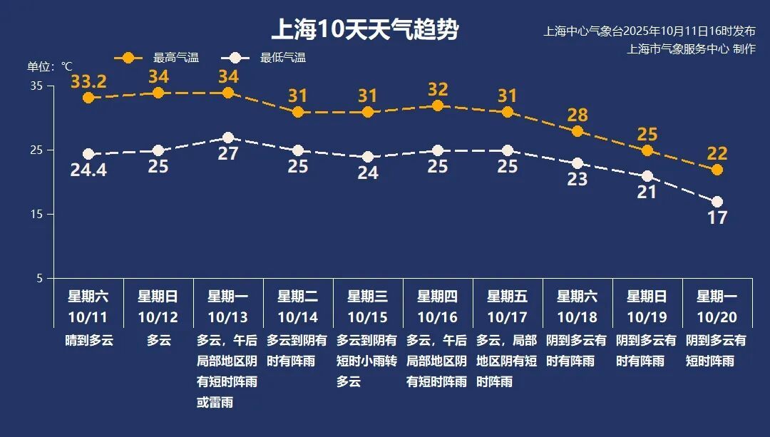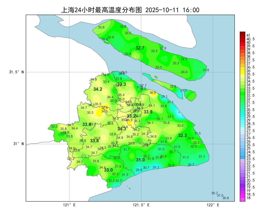 上海今天晴到多云,天空特别蓝。早间全市最低气温在20~24℃之间。白天快速升温,徐家汇站最高气温最终定格在33.2℃,打破了徐家汇站152年以来10月中旬最高气温纪录。郊区中,除了奉贤外,也创建站以来10月中旬同期气温新高。