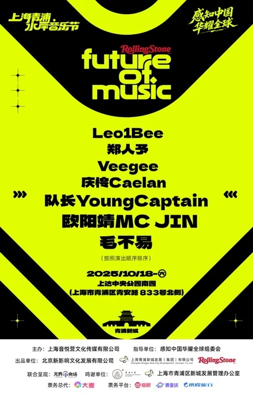 上海青浦水岸音乐节——“感知中国·华耀全球 Rolling Stone China·上海青浦新城音乐节”将在青浦区上达中央公园南园(北侧)震撼上演。本次活动联合“感知中国”品牌与全球音乐文化标杆Rolling Stone,集结Leo1Bee、郑人予、Veegee、庆怜Caelan、队长YoungCaptain、欧阳靖MC JIN、毛不易(按照演出顺序排序)七位实力音乐人,从下午两点到晚上八点四十分,打造一场融合摇滚、流行、说唱等多种风格的视听狂欢。
