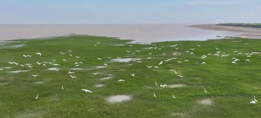 崇明东滩核心区域面积约241.55平方公里,是鸻鹬类等迁徙水鸟的关键中途停歇站。芦苇约占总面积的70%,不仅是湿地生态系统的主要植物,更在固堤净水、调节气候、为鸟类提供栖息环境中发挥着重要作用。