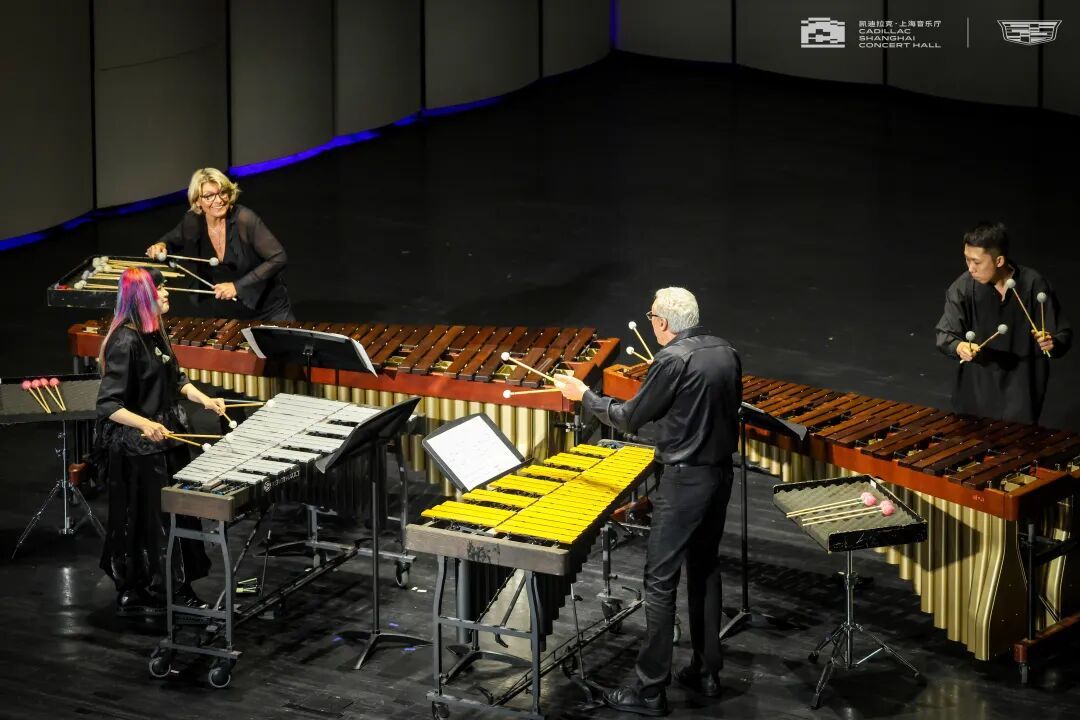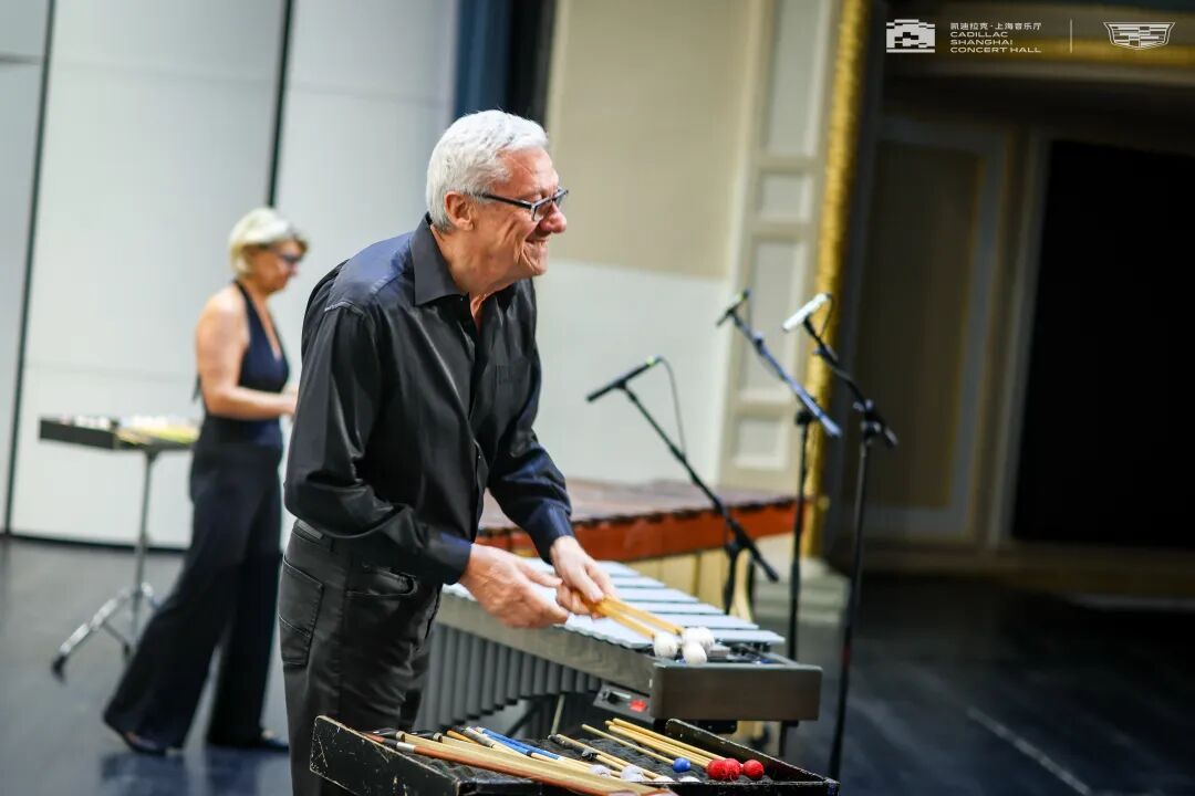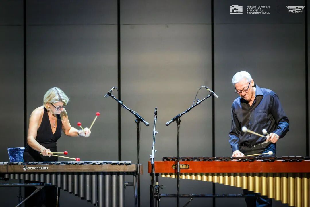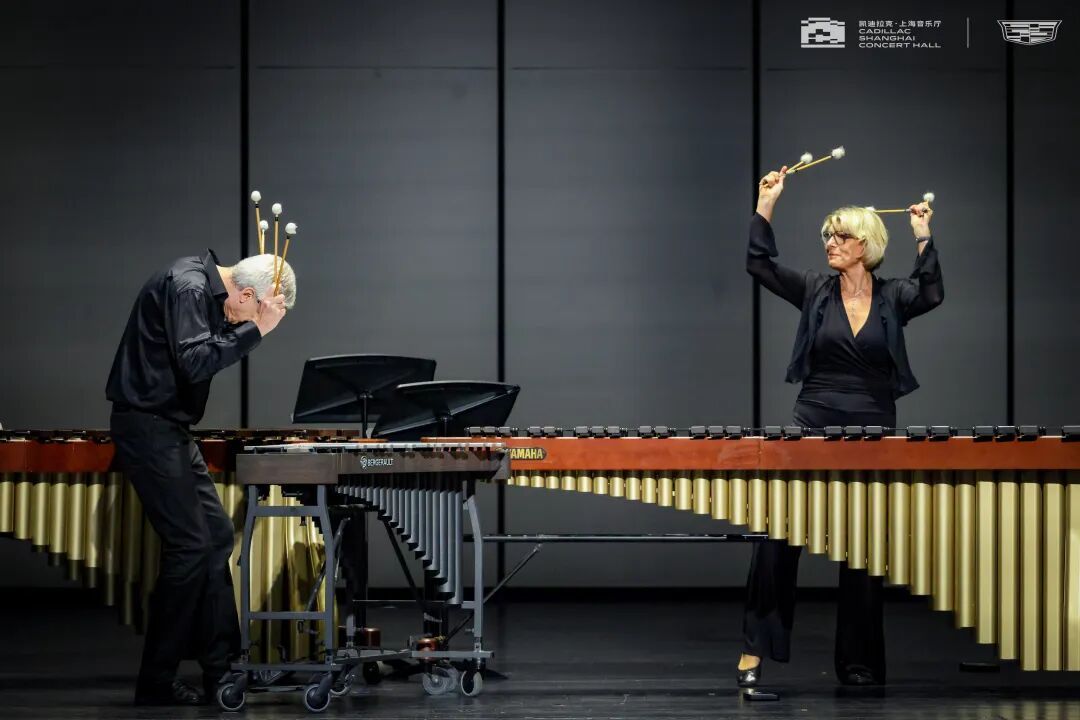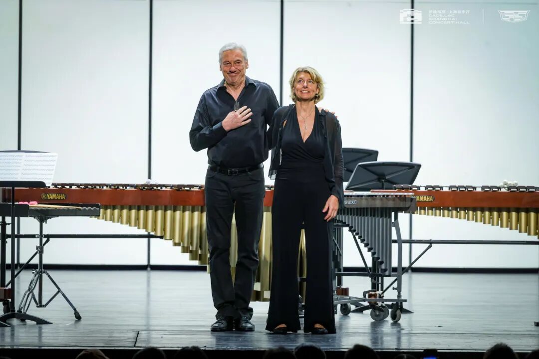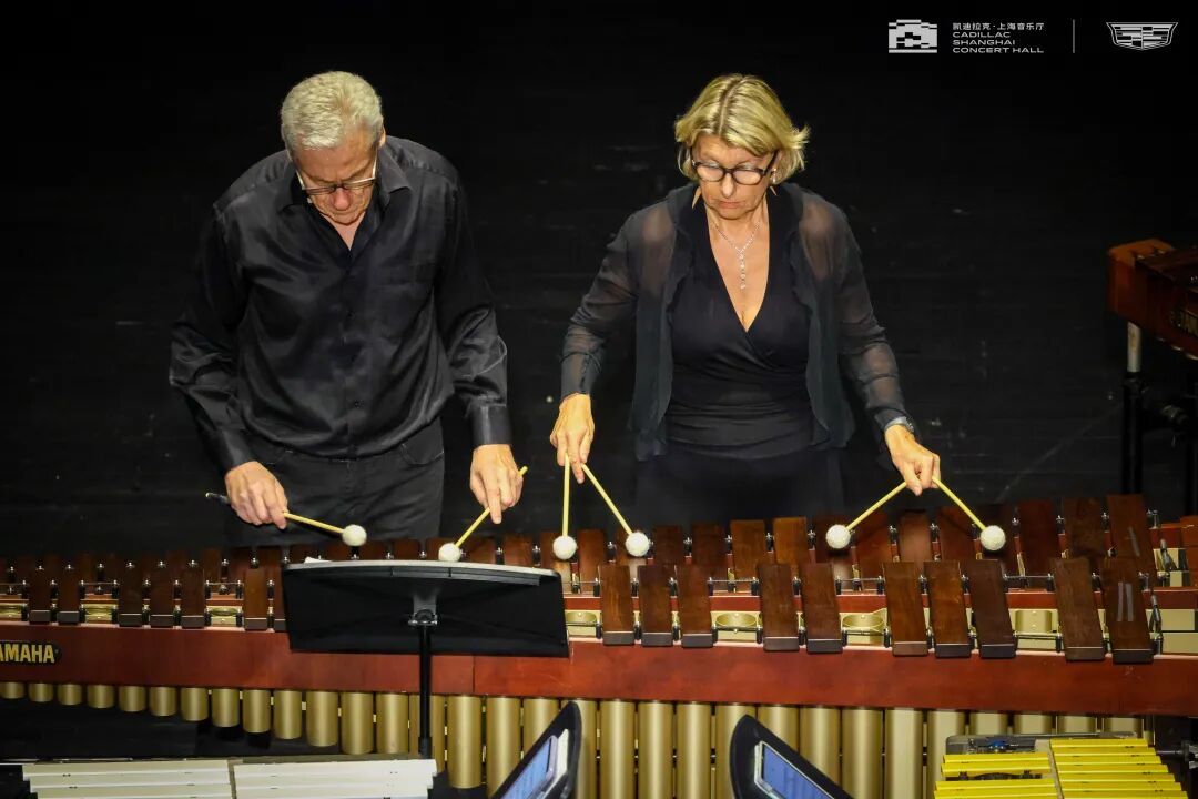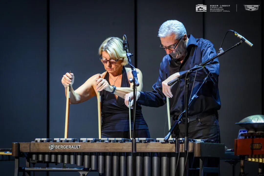 10月11日晚,2025年上海音乐厅“大师公益”系列音乐会再次与观众相约,法国著名作曲家、打击乐演奏家伊曼纽尔·塞约恩携手黄金搭档西尔维·雷纳特带来了一场精彩的颤音琴&马林巴音乐会,用打击乐传递着澎湃的音乐活力与激情,让观众大饱耳福。