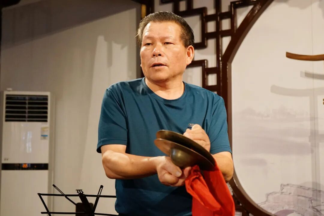 唐家昌起初在演奏队里敲二采钹,跟着谱子上的“扎”“齐”碰合两片薄铜片。“看似简单,倒也有门道。”介绍时,唐家昌拿起二采钹,碰了一下之后拉开,“合在一起的时候,声音要聚合,不能散开。”