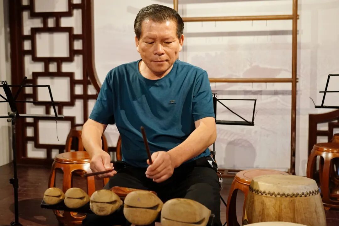 在十锦细锣鼓演奏队,他还学会了五音木鱼,也因此来到了中间位置。需要同时演奏两门乐器时,惯用左手的他,左手敲打五音木鱼,右手则打起鼓板。