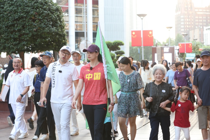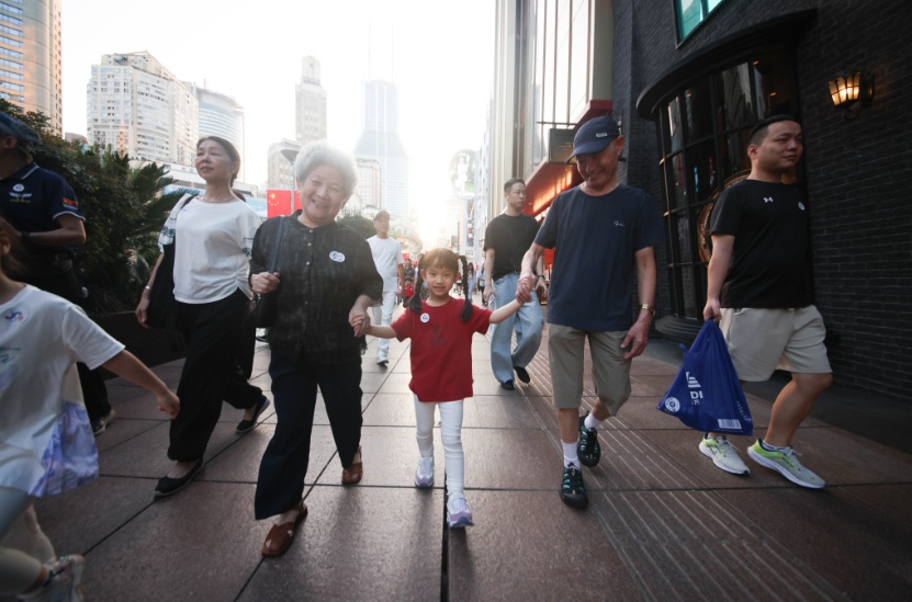 10月11日下午,南京路步行街上迎来了一场别开生面的家庭健步走活动。在吴敏霞、黄雪辰两位奥运冠军明星家庭的带领下,二十余组上海家庭沿着新打造的“乐龄时尚消费街区”动线,体验了集运动、消费、社交于一体的银龄友好环境。