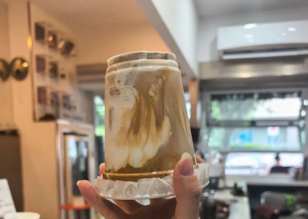咖啡豆都是精心选的云南小粒咖啡,“这是闵行对口帮扶地区的豆子,中度烘焙不太苦也不太酸,是最受大家喜爱的口味”,十一为我介绍道。至于怎么喝,十一还教了我小窍门:外卖拿到手倒过来,就能看到瀑布飞流直下的样子,这也是这款名字的由来;堂食更妙,直接从上到下抿着喝,牛奶、咖啡泡、咖啡液一口混着进嘴,层次特别丰富。除了咖啡,店里的黄油多士也常被顾客点名,来买咖啡必配一份黄油多士的老顾客这样评价,“面包烤得外脆里软,黄油给得足,一口下去特别满足”。