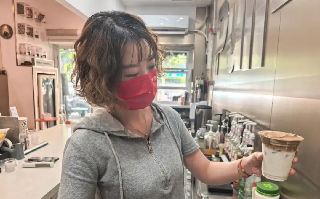 休息时和十一聊天,才知道她以前做的是航运贸易,稳定但总觉得少了点什么。“2023年去杭州玩,喝到了这款瀑布咖啡,当时就觉得太别致了,想着要是在自己家附近开一家就好了。”回来后她没犹豫,在家人的支持下,辞了稳定的工作,加盟了这个品牌,成了上海首店。