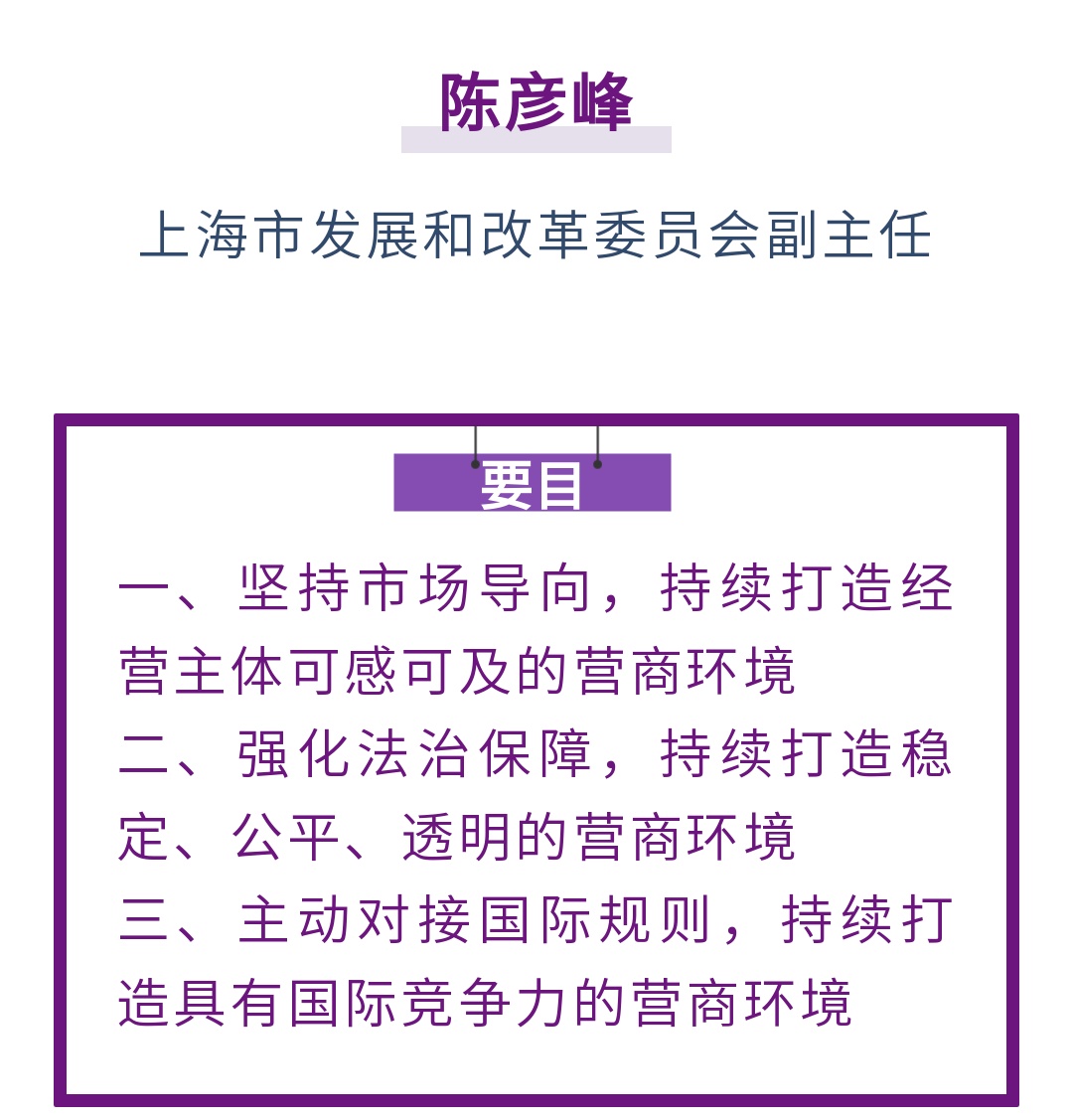 2018年以来,上海每年年初召开优化营商环境大会,发布一版优化营商环境工作方案,以世行对标改革为牵引,带动营商环境的优化提升,从1.0版到8.0版行动方案持续迭代升级,共实施了1200多项任务举措,不断打造贸易投资最便利、行政效率最高、政府服务最规范、法治体系最完善的国际一流营商环境。借今天的机会,我向大家介绍一下上海打造国际一流营商环境的实践。一、坚持市场导向,持续打造经营主体可感可及的营商环境营商环境好不好经营主体说了算。上海始终坚信有求必应无事不扰的理念,以企业感受为第一感受,工作中注重把握好有效市场和有为政府的关系,尊重经营主体地位,想方设法为企业排忧解难,一视同仁解决企业困难。今年我们8.0版行动方案的特点是以提升企业感受为主题,优化8.0版的方案当中,把企业需求最迫切、部门需求高的方向纳入任务当中,攻坚解决裉节问题,公开接受公众监督,重点协调、重点推进、重点督察、重点推进,确保年内取得明显的成效。比如针对企业反映的政策找不到、看不懂、用不上的问题,我们致力于优化惠企政策全流程服务,提高政策的整体性、清晰性、便利性,让企业更好地享受政策。再比如针对企业反应的多头查重复查的问题,我们规范用好检查码,做到无码不检查,检查必亮码,完善监管体系统筹管理。此外我们致力于加强政策落实,打通“最后一公里”,增强街镇园区企业服务能力,针对不同发展阶段不同行业类别的企业提供针对性的服务。二、强化法治保障,持续打造稳定、公平、透明的营商环境法治思想、法治意识、法治思维渗透到营商环境的各环节。上海强化法治保障构建立法、执法、司法、普法的法治化营商环境体系。 一是持续完善立法和常态化的修法机制,及时将改革经验入法。2020年4月,上海在全国范围内率先出台了《上海市优化营商环境条例》,这是上海优化营商环境的基本法。与此同时,陆续出台了《上海市外商投资条例》《上海市推进国际仲裁中心建设条例》等多部地方性法规,形成了优化营商环境的1+X的法治保障体系。二是大力倡导推动包容审慎有温度的监管执法。监管执法既要有尺度也要有温度,针对企业反映首次违法、轻微违法处罚后对企业会造成较大影响的问题,2019年,上海在全国率先发布了第一张《市场轻微违法违规行为的免罚清单》。截至今年上半年,本市现行有效的轻微违法行为依法不予行政处罚清单共35份,覆盖28个执法条线。三是加强政府法院联动,不断提升司法审判绩效。我们紧紧围绕降低市场主体解决纠纷制度性成本的目标,建立健全政府、法院联动的协调机制,依托数字化的手段持续提升民商事案件的审判实效,针对办理破产领域,上海高院会同发改委等16家政府部门出台加强中小微企业破产保护措施,推进企业破产信息核查一件事改革,构建符合中小微企业需求的简易破产和司法救助机制,2024年的天数比23年缩短21天。四是注重普法宣传合规引导。在公安、消防、生态环境保护、文化市场、卫生健康、人力资源社会保障等执法领域加强对经营主体的合规引导,制定金融、知识产权、人工智能、医疗与生命科学等行业合规指引。在高频法治风险批示,常见问题处置等方面为企业提供指引,引导企业建立完善的合规制度。三、主动对接国际规则,持续打造具有国际竞争力的营商环境作为中国对外开放的窗口,一直以来国际化是上海城市的亮丽底色,我们认为国际化就是对接国际高标准的经贸规则,促进规则规制管理标准等相通相融,最大限度建立跨国企业的成本。近年来上海积极对标世行营商环境的评估体系,以此为牵引推动上海营商环境攻坚突破整体提升。我们深入学习借鉴世行营商环境的方法论,不断推进改革,把世界银行指标方法学作为优化营商环境的重要参照,准确把握其中的底层逻辑实践要求,按照世行评估强调的政策法规的公开、稳定透明度,公共服务的普惠、可及、数字化,企业感受的全面、平衡、可量化等评估导向,推动营商环境工作不断拓展深化。在市场准入、获取经营场所、公用设施服务等十大领域实施对标改革,面向企业的服务和监管举措不断优化,企业感受和体验也得到了不断提升。比如我们在解决商业纠纷领域,上海推进涉外商事海事临时办法,对特定地点、特定规则、特定人员、临时仲裁司法案件集中管辖稳定,全国首例涉外海事临时仲裁案件在上海做出裁决。4月19日世界银行发布了对企业开展调查的结果,在企业调查涉及营商环境的59项测评点中,上海有22项测评点达到了全球最优水平。比如在共建可靠性方面,上海填报的停电次数为零,这些测评点达到全球最优水平。除此以外在纳税时长,贷款时长互联网稳定性都达到了全球先进水平。营商环境建设,只有进行时,没有完成时。优化营商环境需要政企沟通、双向奔赴,也需要专家学者的协同共建、同题共答。下一步,我们注重营商环境的顶层设计和整体推进,为各类经营主体在沪发展壮大提供更好的一流营商环境,共同谱写上海经济高质量发展的篇章。