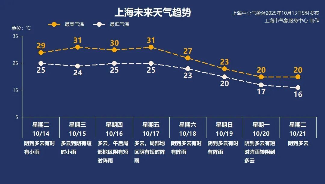 受高空槽影响,申城明天起多降水过程,气温略有下降,预计最高气温在29~31℃。周六起受冷空气影响,有效降温来了,预计周日及下周初的最高气温降至“2”字头,秋天总算快来了。