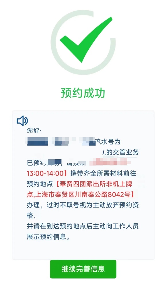 新车上牌的,点击“继续完善信息”按钮,完成登记信息在线预填报,可有效缩短窗口办理时间。