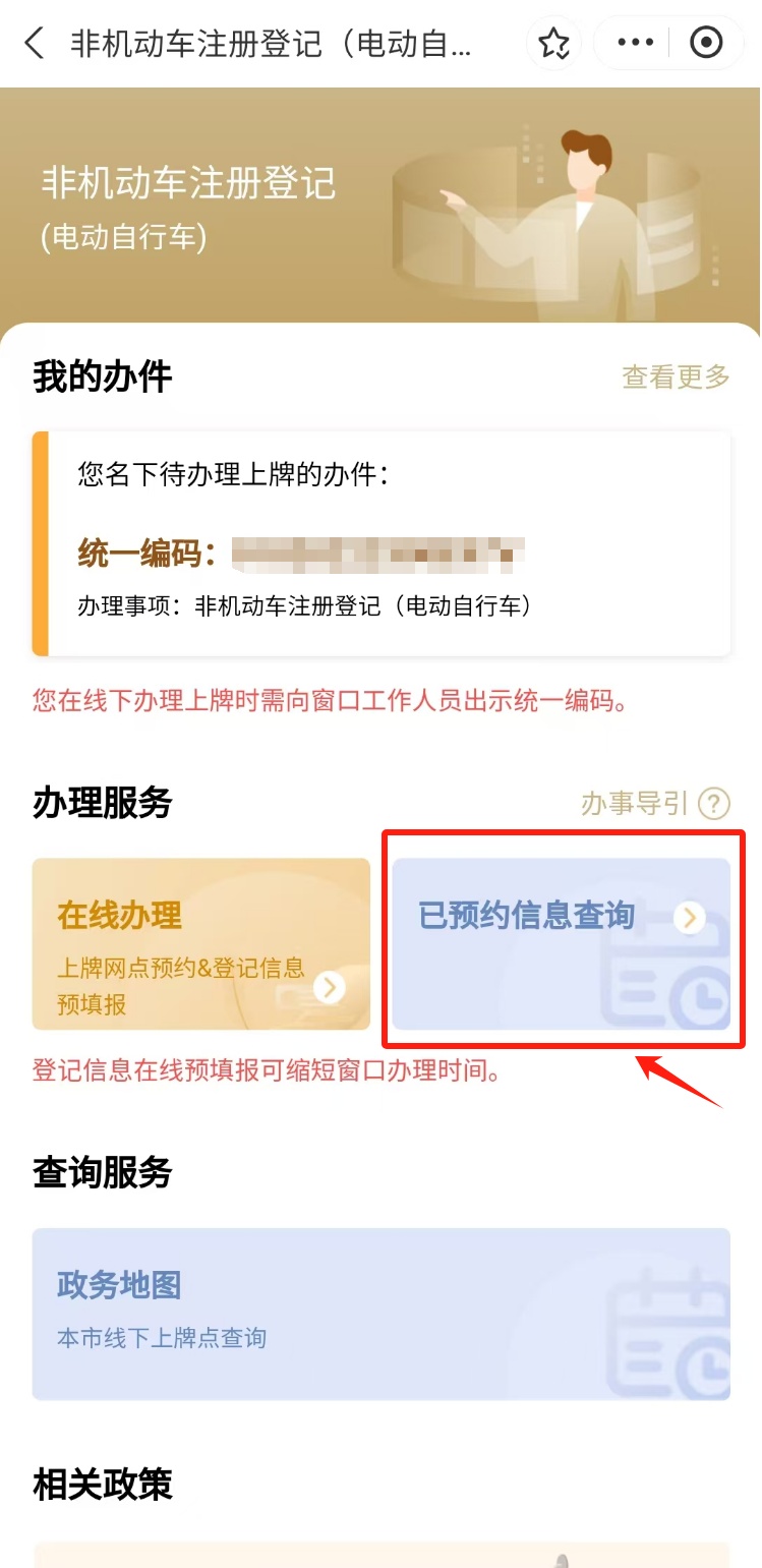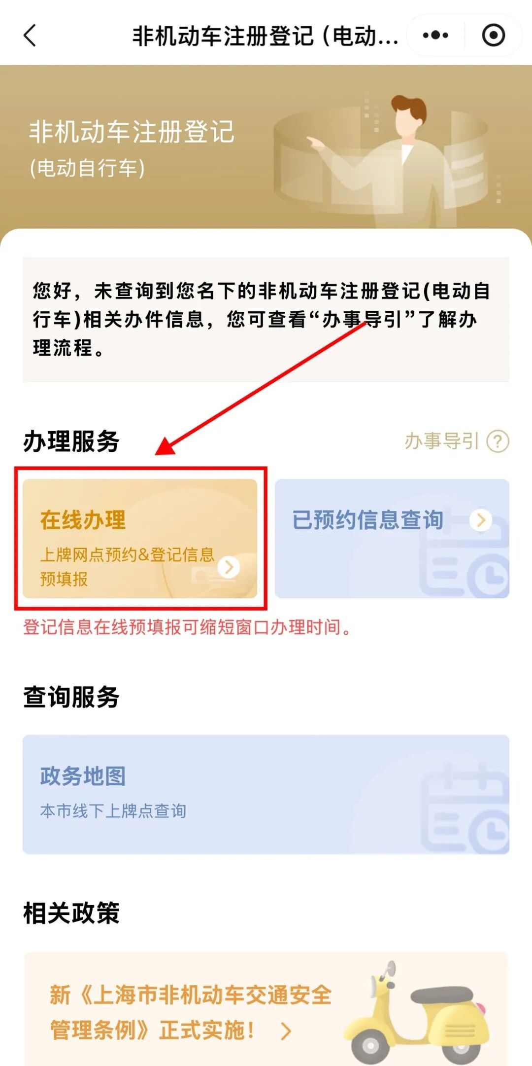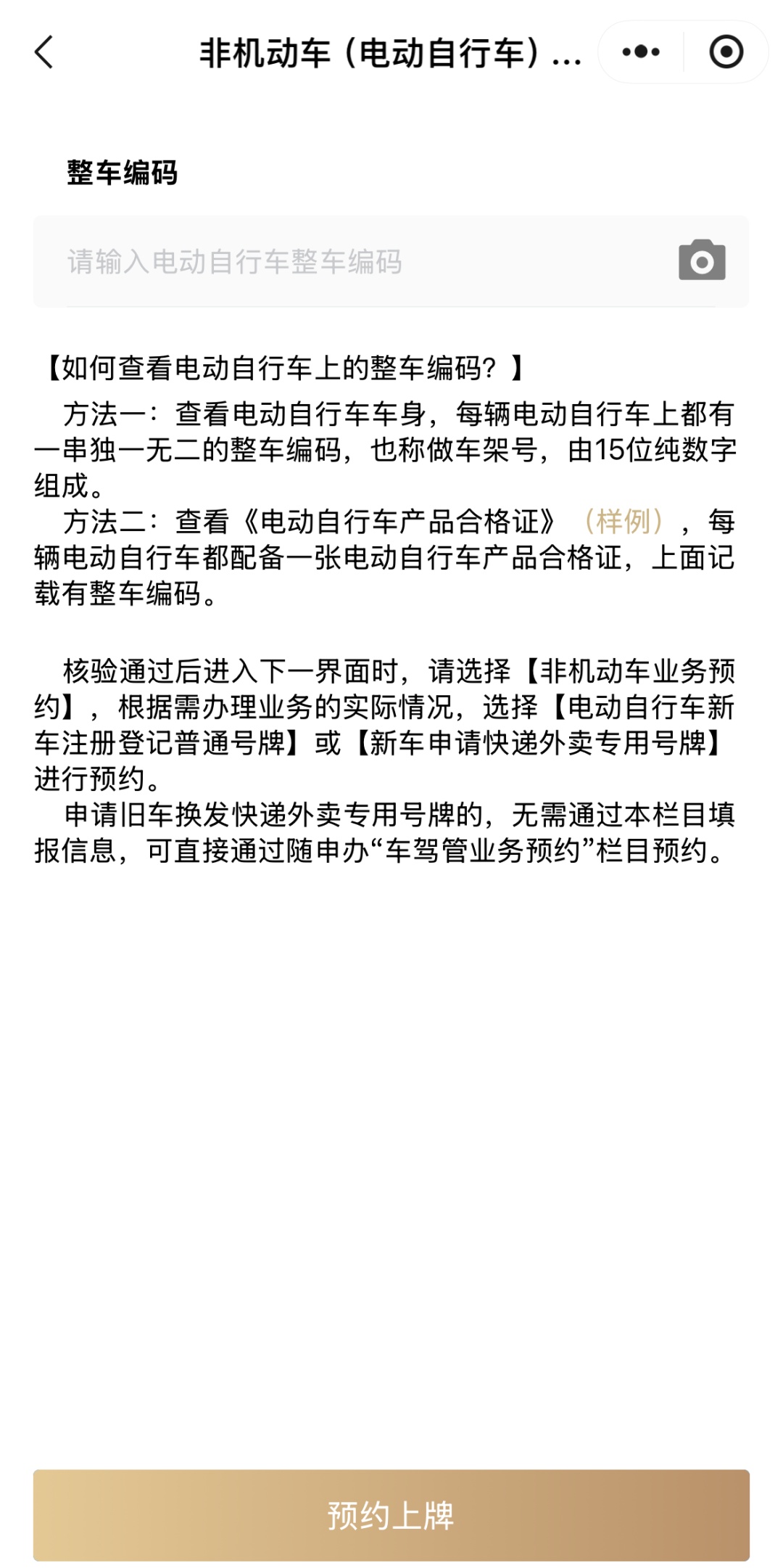 在“非机动车注册登记(电动自行车)”专区内,点击办理服务的“在线办理”,根据提示点击“立即前往预约”,输入您的整车编码后点击“预约上牌”。