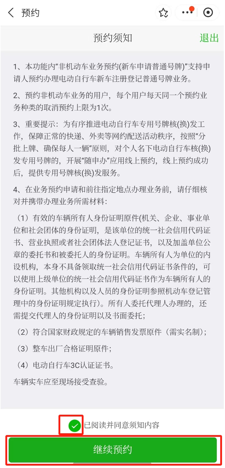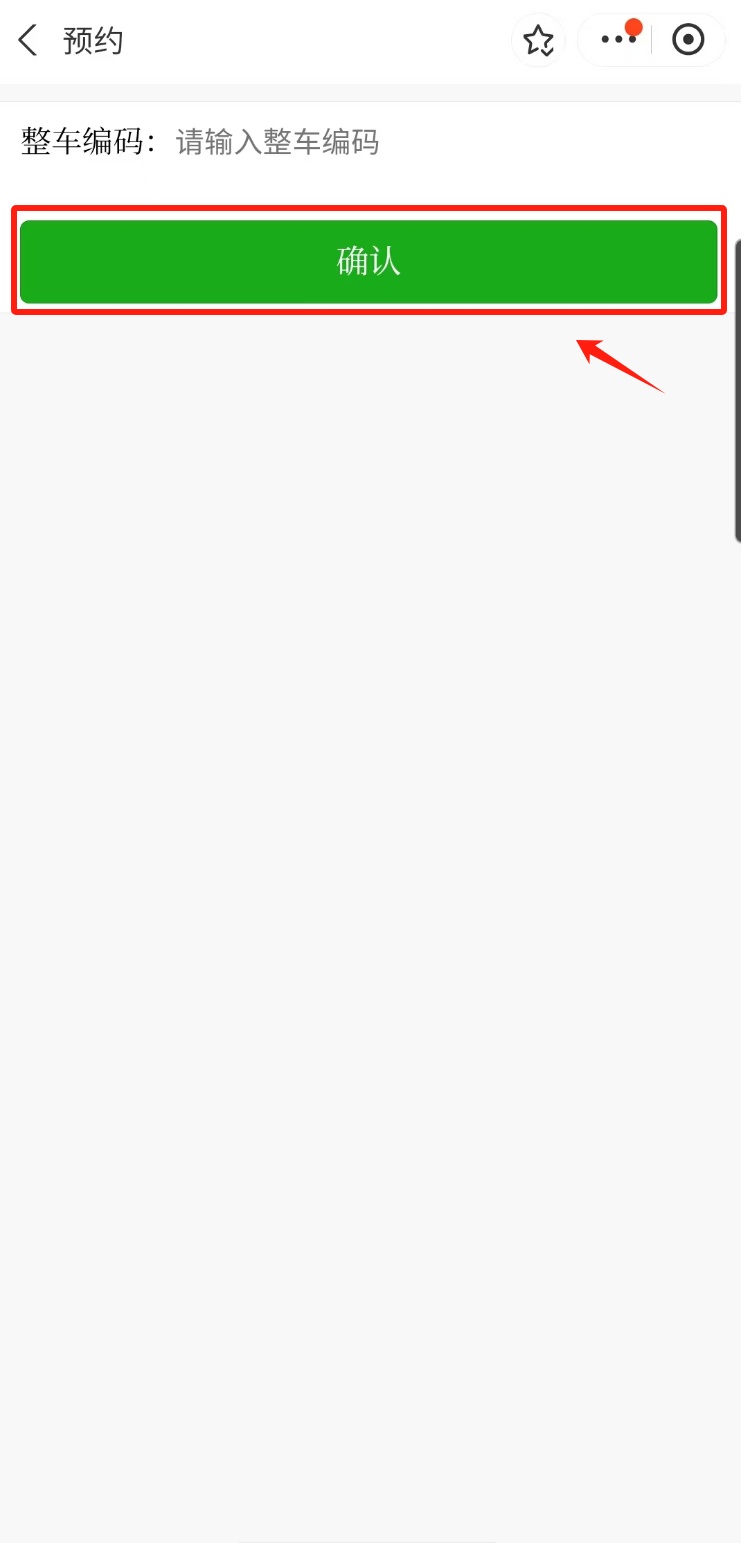 阅读“预约须知”并勾选同意,点击“继续预约”,输入整车编码后点击“确认”。