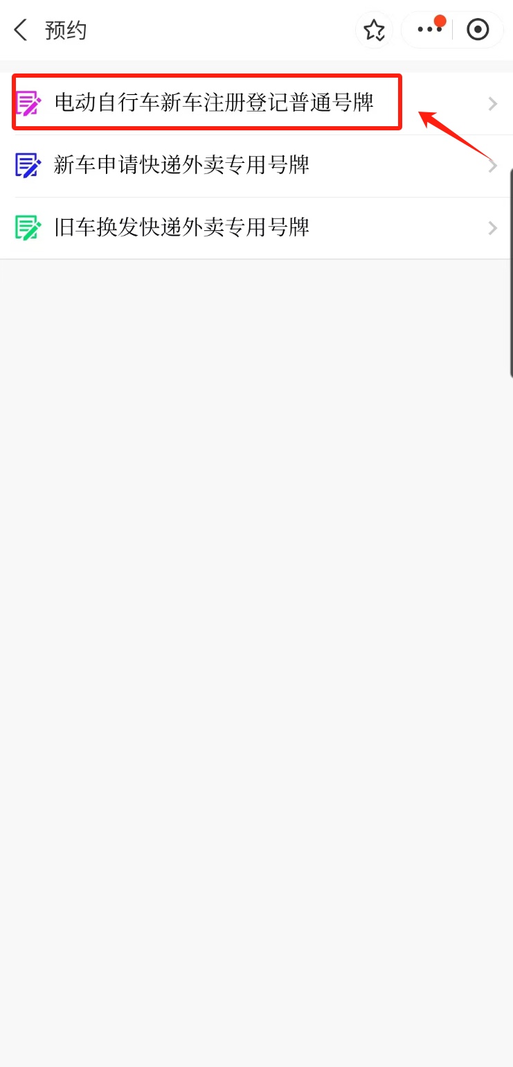 核验通过后,选择“非机动车业务预约”,点击“电动自行车新车注册登记普通号牌”(也可依据实际情况选择“新车申请快递外卖专用号牌”或“旧车换发快递外卖专用号牌”)。
